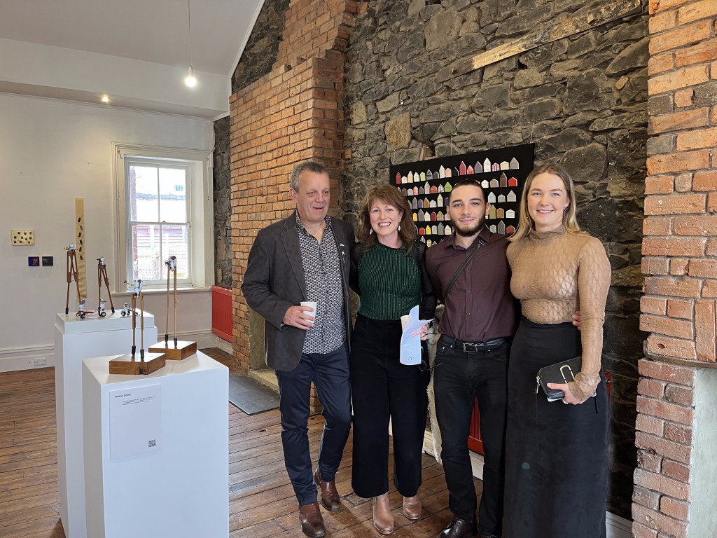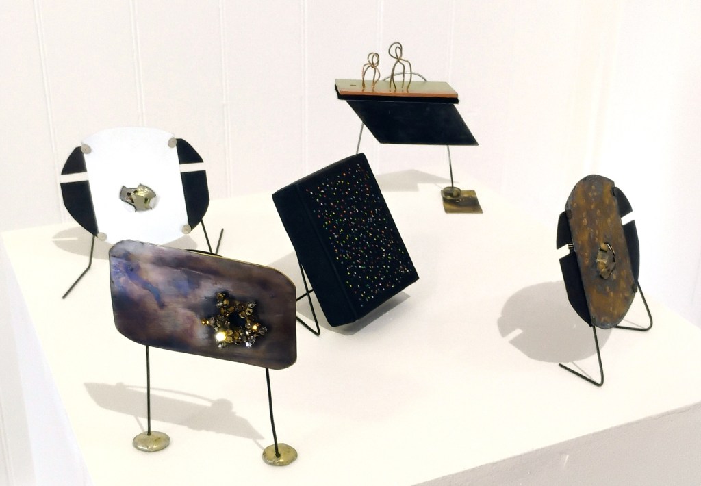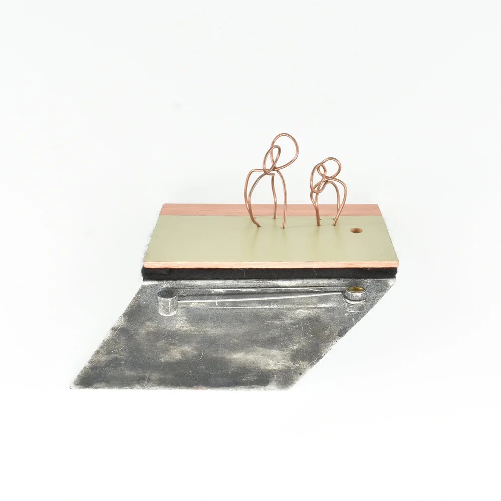 Great teachers cast long shadows (Peter and Viv) copper wire, oxidised aluminium, oxidised sterling silver, brass, felt, laminate sample, paint