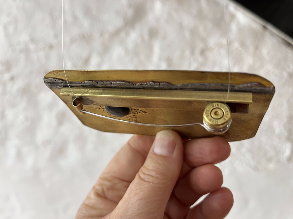 Bulletproof Oxidised brass, bullet casings, brass wire, polymer clay and Swarovski crystal beads