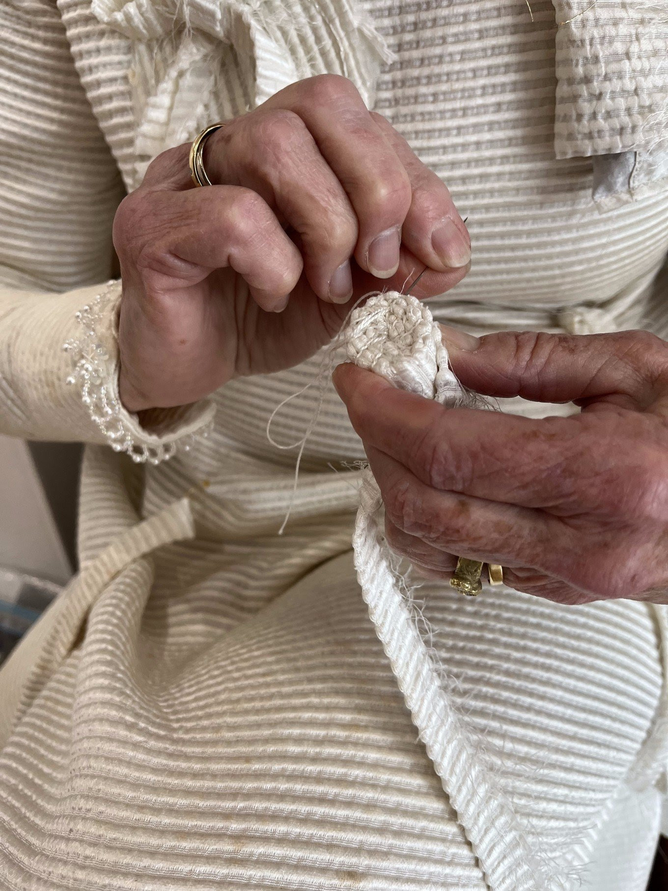 For her performance work Palimpsest, the artist created jewellery pieces from her wedding dress whilst wearing it.